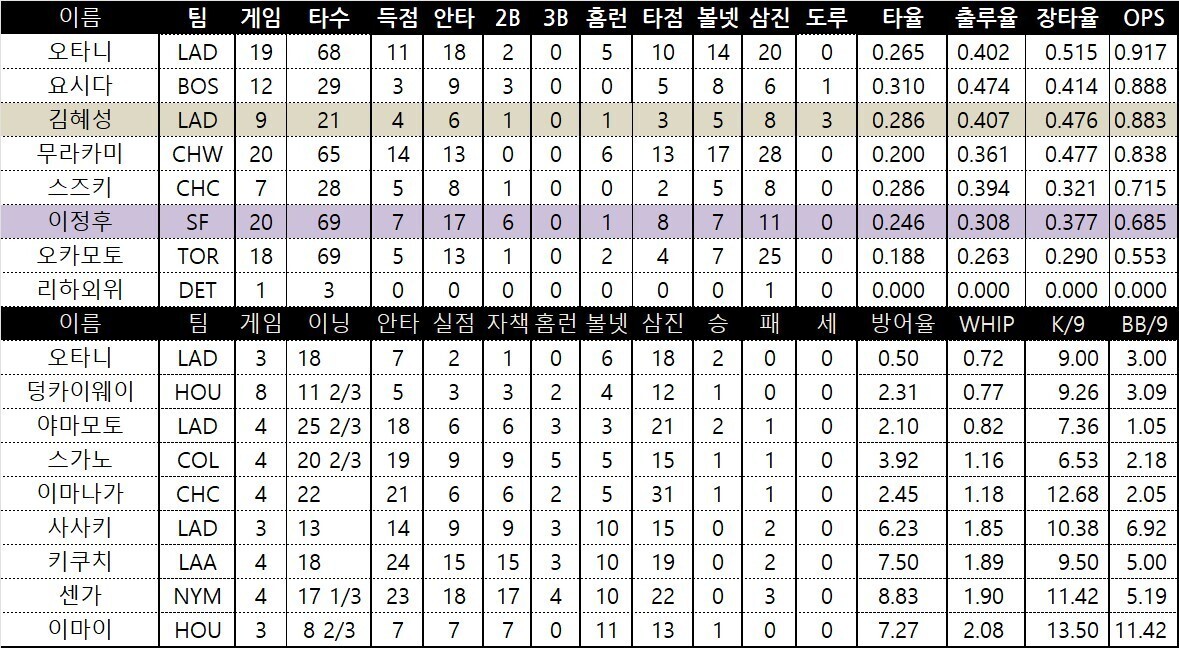 이정후 1안타 1볼넷 김혜성 1안타 1볼넷 2도루 무라카미 6호홈런 팀순위및 일요일 선발투수