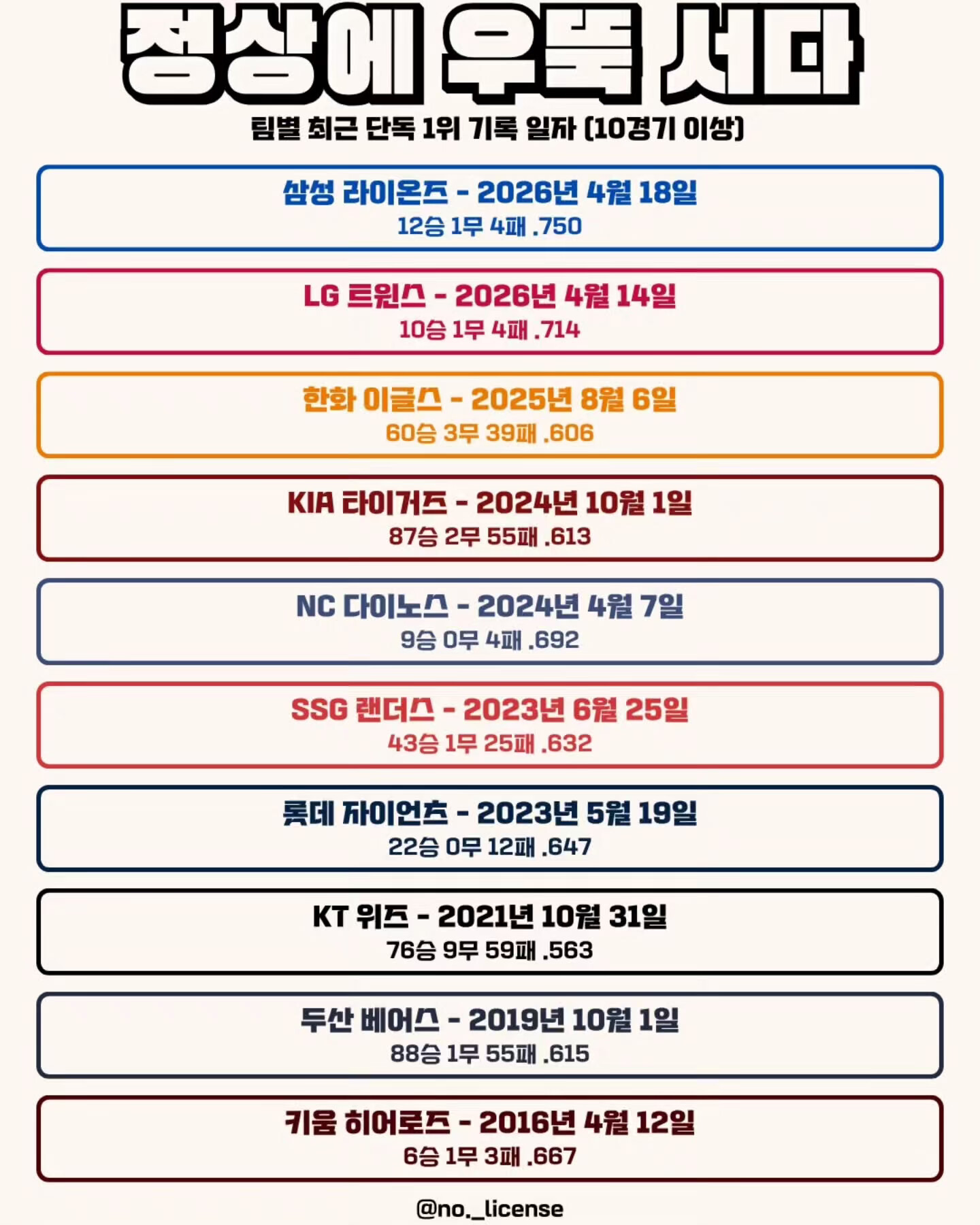 크보 10개구단 최근 10경기 이상 단독1위 기록 일자