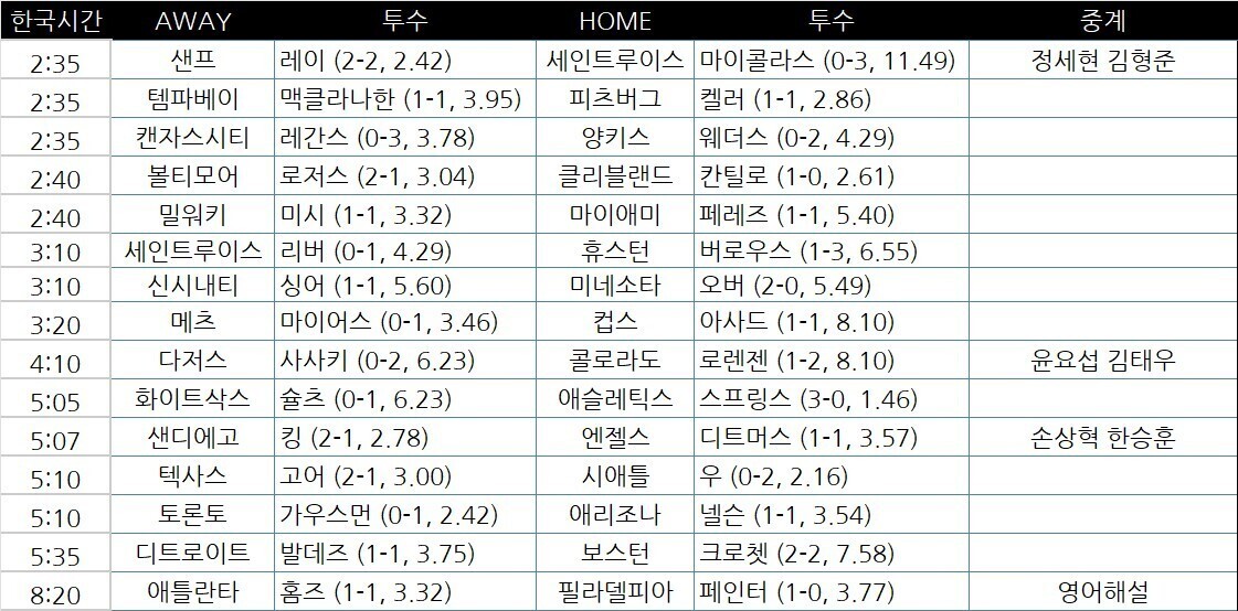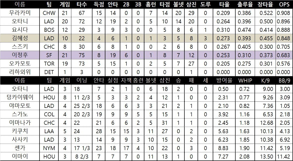 이정후 2안타 1득점 김혜성 무안타 키쿠치 6이닝 무실점 팀순위및 월요일 선발투수